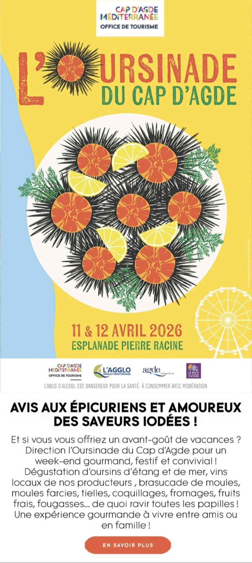 Organisée par l’association L’Oursinade du Môle, en partenariat avec La Route des Vignerons et Pêcheurs, l’Agglo Hérault Méditerranée, la Ville d’Agde et l’Office de tourisme Cap d’Agde Méditerranée, cette manifestation met à l’honneur les richesses locales.