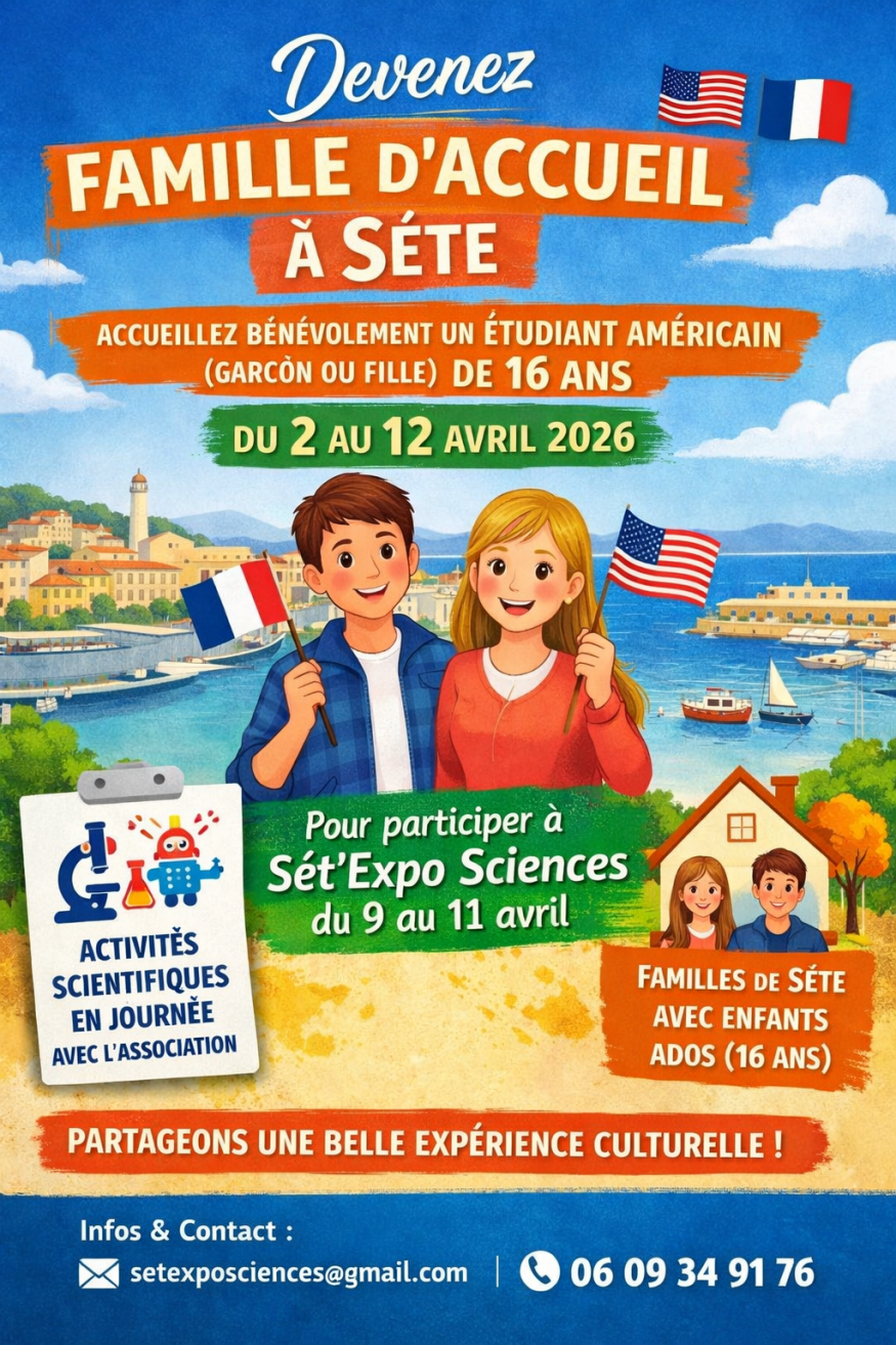 Dans le cadre de l’édition 2026 de Sèt’Expo Sciences, une recherche de familles d’accueil bénévoles est lancée afin de recevoir de jeunes étudiants américains, filles et garçons âgés de 16 ans, du 2 au 12 avril.