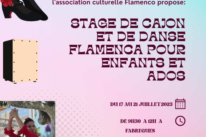 Un stage de danse d'initiation au flamenco pour les enfants et ados à partir de 6 ans et jusqu' à 14 ans du 17 au 21 juillet de 9H30 à 12H . Il y aura aussi une initiation au cajon ( percussion flamenca) pour travailler le rythme.