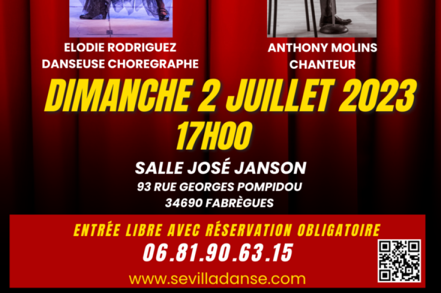 L’association Sévilla danse organise, dimanche 2 juillet à 17 h, au centre culturel José-Janson, salle Claude-Etienne, un spectacle de flamenco moderne avec Elodie Rodriguez, danseuse chorégraphe et Anthony Molins, chanteur.