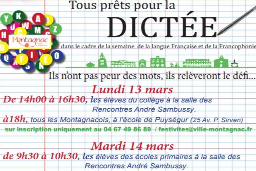 Dans le cadre de la semaine de la langue Française et de la Francophonie, et pour sa troisième édition à Montagnac, la Mairie organise LA DICTÉE POUR TOUS ! Lundi 13 mars, de 14h00 à 16h30, les élèves du Collège se réuniront à la Salle des Rencontres André Sambussy.
