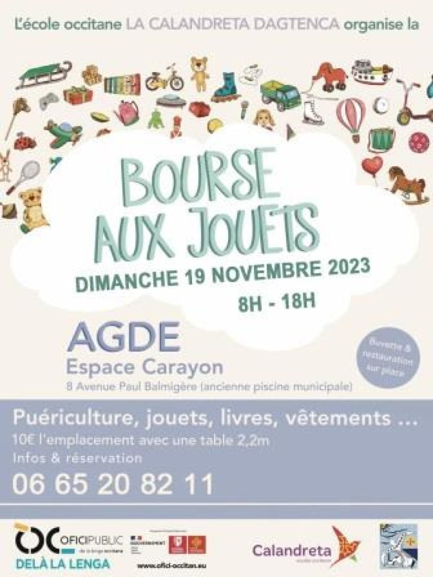 La Calandreta Dagtenca organise son annuelle Bourse aux Jouets, qui aura lieu le dimanche 19 novembre 8h00 à 18h00 à l'espace Carayon à Agde.