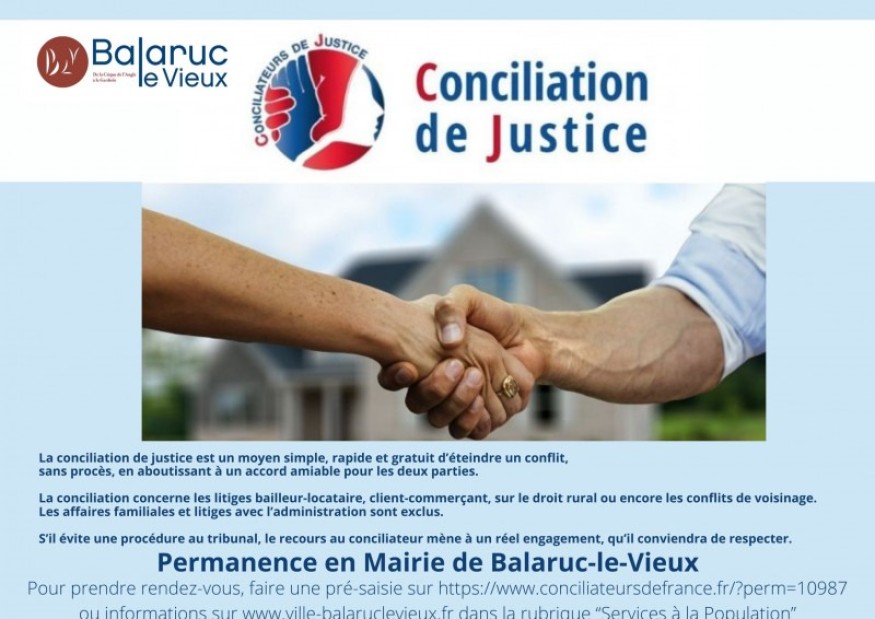 La conciliation de justice est un moyen simple, rapide et gratuit d’éteindre un conflit, sans procès en aboutissant à un accord amiable pour les deux parties. La conciliation concerne les litiges bailleur-locataire, client-commerçant, sur le droit rural ou encore les conflits de voisinage. Les affaires familiales et litiges avec l’administration sont exclus. S’il évite une procédure au tribunal, le recours au conciliateur mène à un réel engagement, qu’il conviendra de respecter. Un conciliateur de justice assurera régulièrement des permanences sur rendez-vous en Mairie de Balaruc-le-Vieux.
