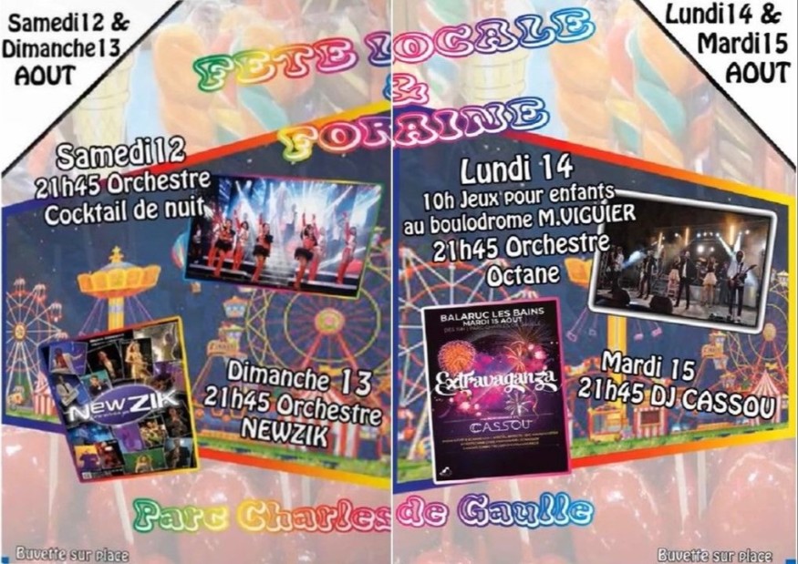 Le Comité des Fêtes de Balaruc-les-Bains organise des soirées dansantes durant la Fête Locale jusqu'au 15 août au Parc Charles de Gaulle.