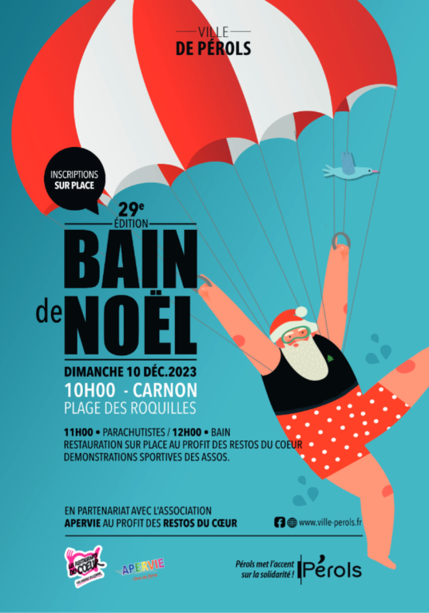 On vous attend nombreux pour la 29e édition DU BAIN DE NOËL DES RESTOS DU COEUR 34, dimanche 10 décembre à partir de 10h sur la plage des Roquilles à Carnon ouest.