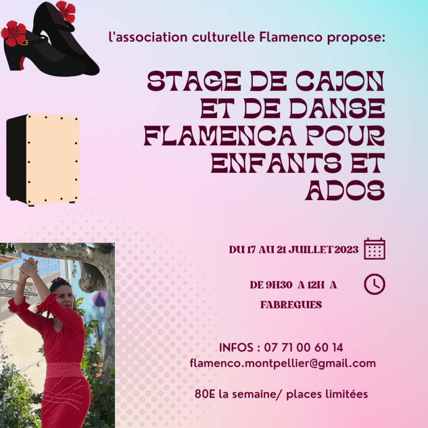 Un stage de danse d'initiation au flamenco pour les enfants et ados à partir de 6 ans et jusqu' à 14 ans du 17 au 21 juillet de 9H30 à 12H . Il y aura aussi une initiation au cajon ( percussion flamenca) pour travailler le rythme.