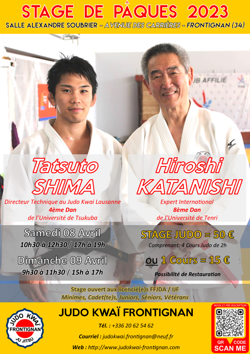 Le Judo Kwaï Frontignan organise Samedi 8 etDimanche 9 Avril son traditionnel Stage de Pâques, sous la direction technique de : - M. Hiroshi KATANISHI, Expert International, 8ème dan, de l’Université de Tenri. - M. Tatsuto SHIMA, 4ème Dan, de l’Université de Tsukuba, Directeur technique du Judo Kwai Lausanne. Ce stage technique garde son ambiance conviviale et familiale.