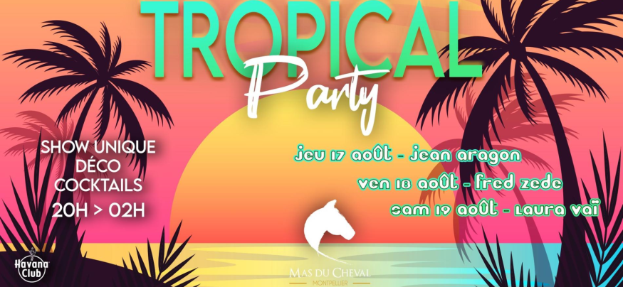 La Tropical Party se tiendra au Mas du Cheval les jeudi 17, vendredi 18 et samedi 19 août 2023 de 20h à 02h !