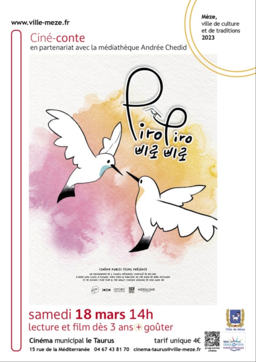 Ciné-conte au cinéma municipal Le Taurus en partenariat avec la médiathèque Andrée Chedid « Piro Piro » un ciné conte dès 3 ans et goûter offert |tarif unique 4€40 min.
