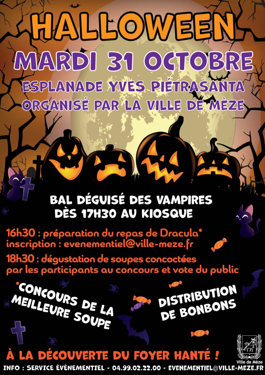 Bal d’halloween, animation musicale, distribution de bonbons, concours de la meilleure soupe de courge (potiron, butternut, potimarron…) et visite du foyer hanté seront au programme.