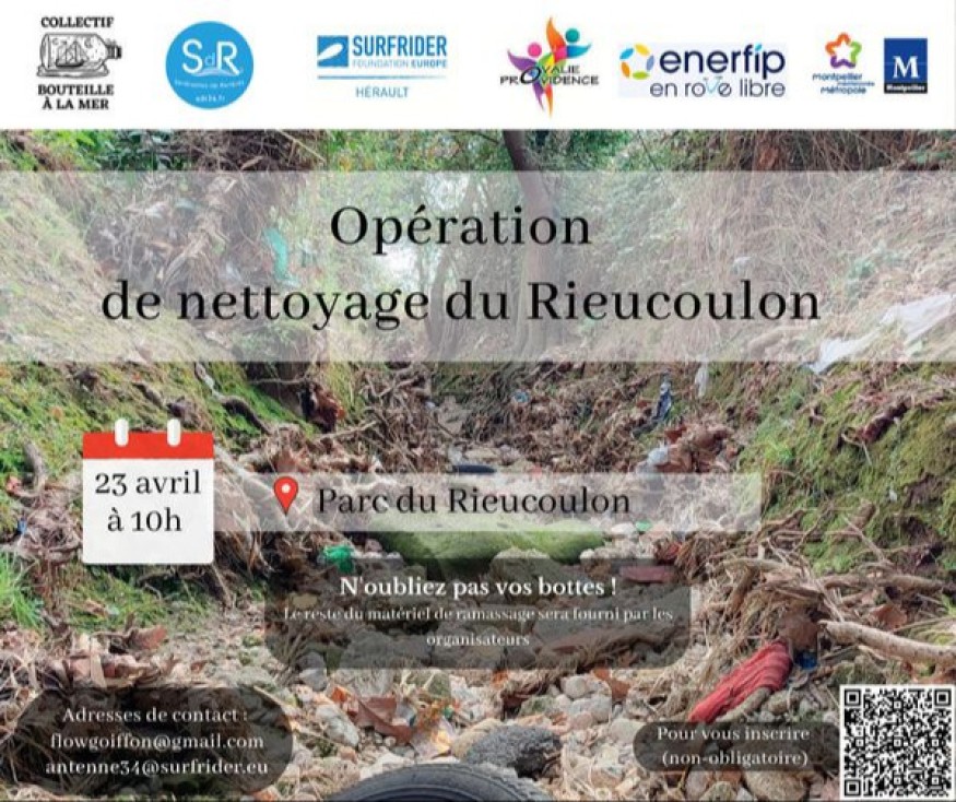 L’antenne de l’Hérault de Surfrider Foundation, le Comité de Quartier Ovalie Providence, l’association Sentinelles de rivières 34, l’association Enerfip en roue libre ainsi que le collectif d’associations Bouteille à la Mer organisent une grande opération de nettoyage du ruisseau le Rieucoulon à Montpellier le dimanche 23 avril à partir de 10h.