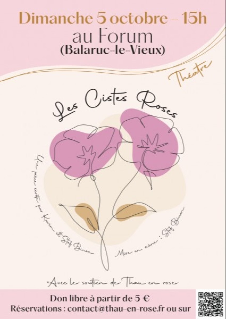 Le dimanche 5 octobre à 15h, le Forum de Balaruc-le-Vieux accueillera la pièce de théâtre « Les Cistes Roses », une création née de séances de théâtre-thérapie animées par Stéphanie Binon.
