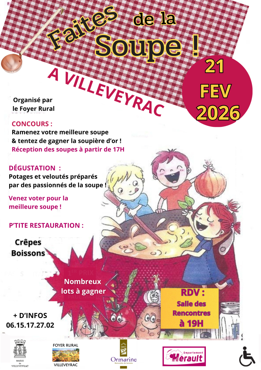 Le Foyer Rural de Villeveyrac organise le concours de la meilleure soupe le samedi 21 février, à la Salle des Rencontres, place du Marché aux Raisins.