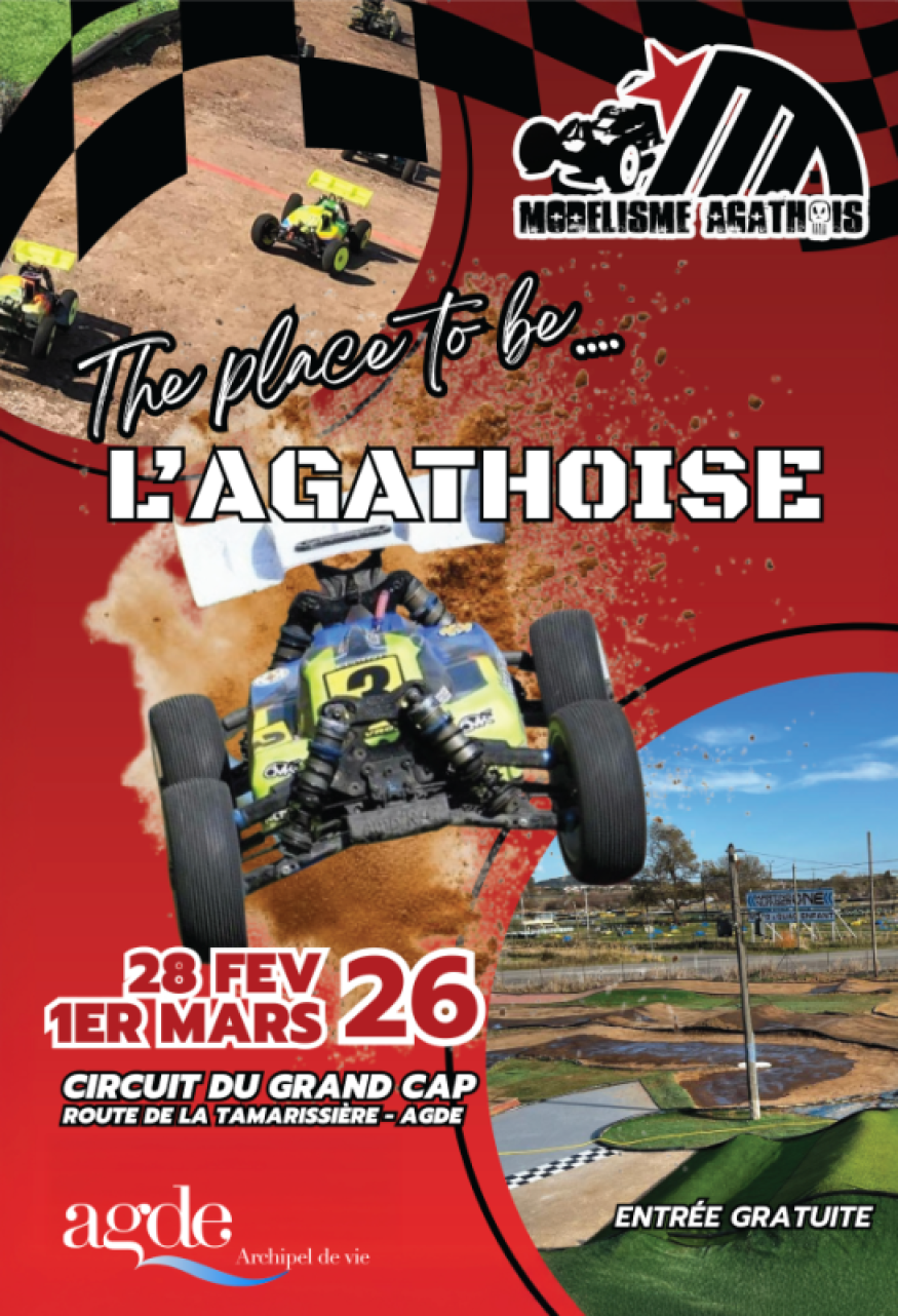 Samedi 28 février et dimanche 1er mars , le Circuit Grand Cap à Agde accueillera la 11e édition de “L’Agathoise”, une spectaculaire compétition de buggy tout terrain électrique et thermique (échelle 1/8e).