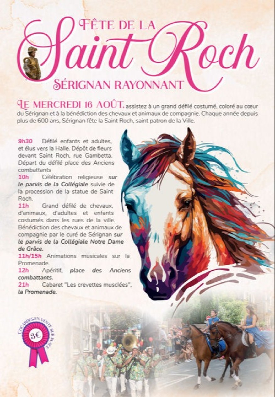 Depuis plus de 600 ans, Sérignan fête la Saint Roch, le Saint Patron de la Ville! Venez assister à un immense défilé costumé et coloré avec une bénédiction des chevaux et animaux de compagnie. A partir de 9h30 des défilés, une célébration religieuse, des animations musicales, un apéritif et un cabaret…une journée festive en perspective