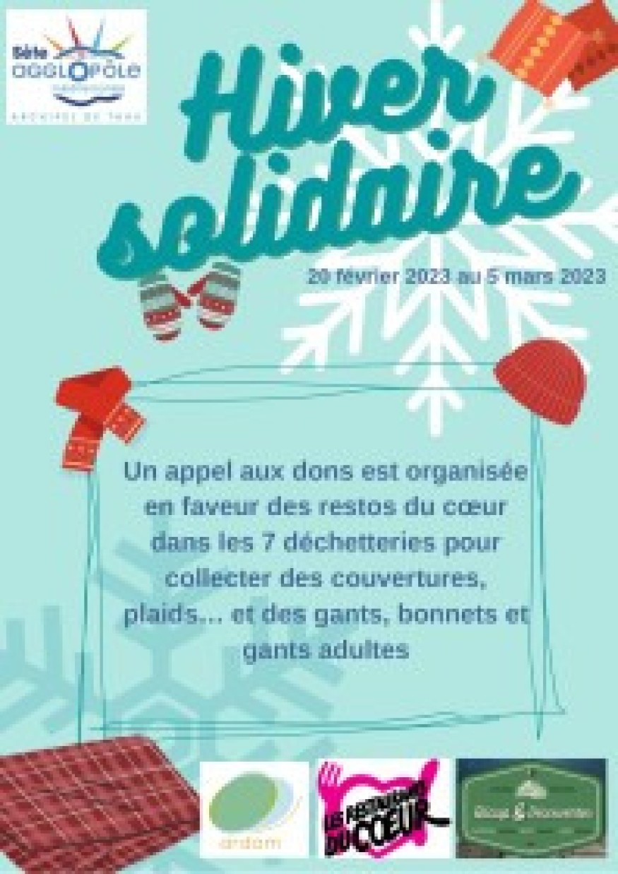 Du 20 février au 5 mars Une action de collecte de vêtements chauds et linge de maison va être réalisée dans le cadre d’un partenariat entre les associations Récup et Découvertes, les restos du cœur, l’ARDAM et l’Agglopôle, afin de permettre à des personnes de pouvoir lutter contre le froid. Cette action va permettre de pouvoir aborder le thème du réemploi et sensibiliser le public des déchetteries. Cette action se déroulera sur les 7 déchetteries* du territoire du 20 février au 5 mars. Couvertures, couettes, plaids, gants et bonnets pour adultes seront les bienvenus aux horaires d’ouverture des déchetteries, des bacs sont prévus à cet effet.