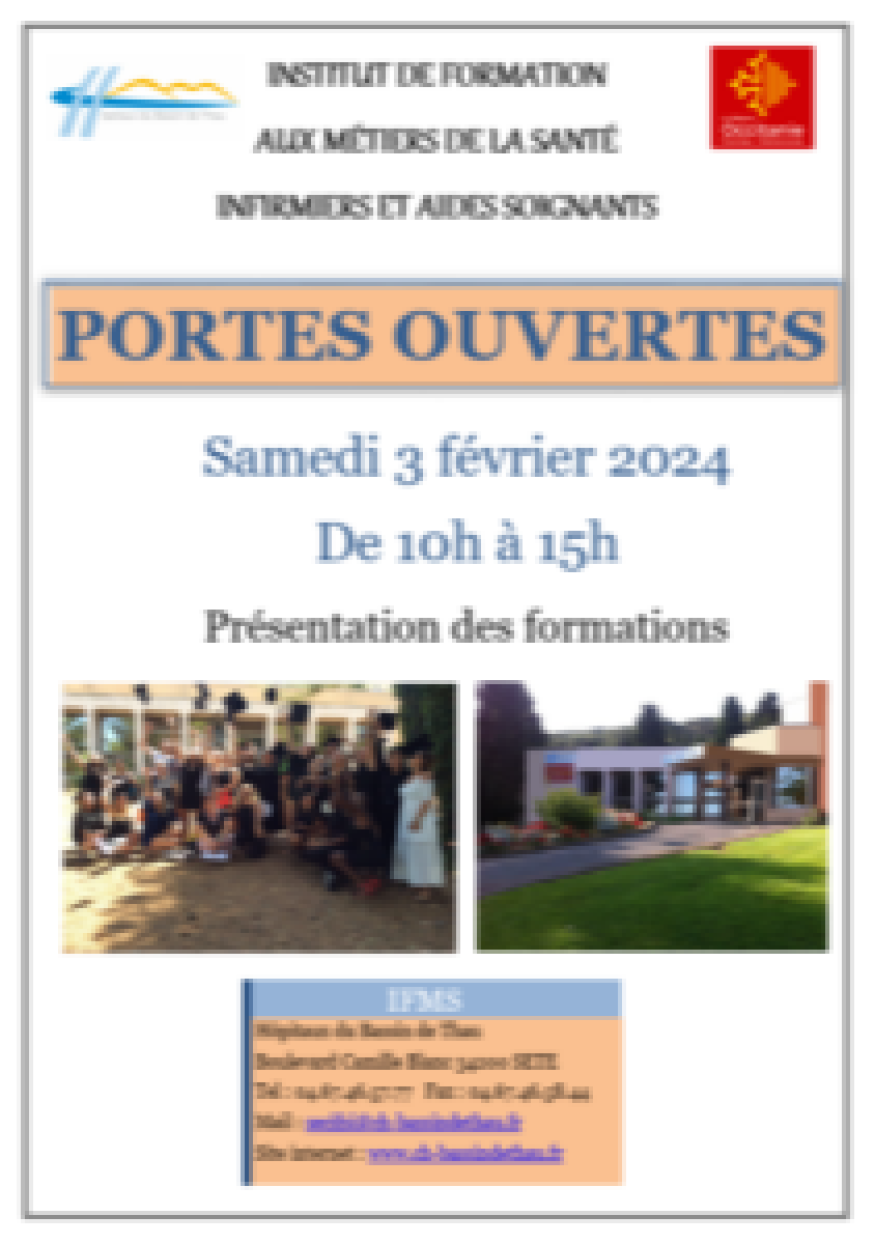 L’Institut de formation aux métiers de la santé (IFMS) des Hôpitaux du bassin de Thau organise sa journée portes ouvertes le samedi 3 février de 10h à 15 h, boulevard Camille-Blanc à Sète.
