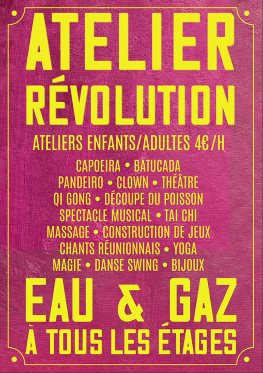 L’Atelier Révolution propose une série de 17 nouveaux ateliers, à la carte ou à l’année, pour tous les âges, tous niveaux et tous les goûts, à 4 €/h ou 100€ l’année.