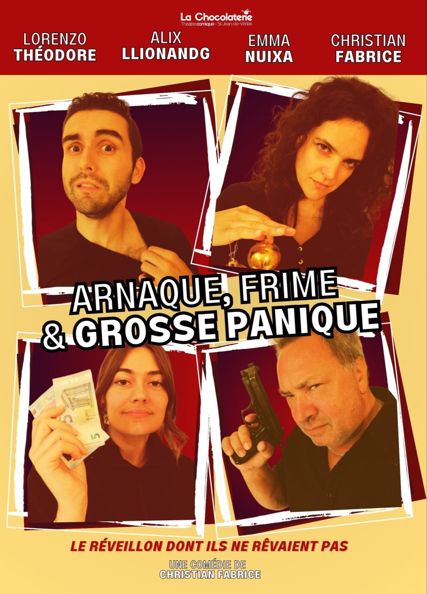 Vendredi 29 ,samedi 30 à 21h et dimanche 31 décembre à 21h15 et 23h15 "Arnaque, frime et grosse panique" plonge le public dans un sujet d’actualité. Deux cambrioleurs s’introduisent dans un appartement vide le soir du réveillon, mais les propriétaires reviennent et les surprennent. Un réveillon d’enfer.