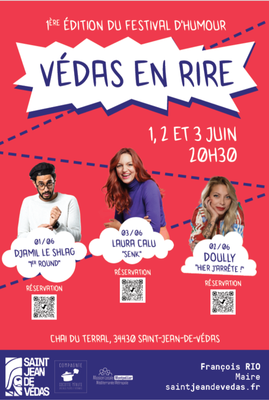 Du 1er au 3 juin, la Ville de Saint-Jean-de-Védas lance son festival d’humour « Védas en Rire » au Chai du Terral. Pour cette première édition, nous accueillerons Djamil le Shlag, Doully et Laura Calu.