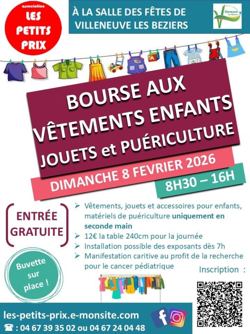 Le dimanche 8 février, de 8h30 à 16h, la salle des fêtes de Villeneuve-lès-Béziers accueillera une bourse aux vêtements pour enfants, dédiée à la puériculture, aux jouets et aux accessoires.