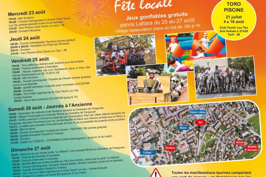 Pour les jeunes lattois qui souhaitent participer à la fête votive de Lattes Centre :Rendez-vous le lundi 21 Août à 11h45 aux arènes pour l’inscription des bandes et la remise des bracelets. A cette occasion un rafraichissement vous sera offert.