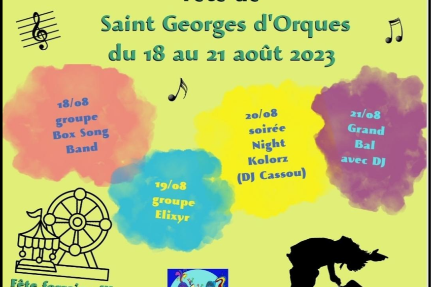 Ne manquez pas les Fêtes votives de St Georges d'Orques du 18 au 21 août 2023 !Tous les jours buvette tenue par le comité de 19h à 1h et fête foraineLieu : parking du stade derrière le collègeVendredi 18 août 2023 : ouverture de la fête avec le groupe orchestre "Box Song Bang" de 19h à 1h, spectacle visuel et musical extraordinaire avec de nombreuses surprises.Samedi 19 août 2023 : Bal animé par l'orchestre Elixyr de 21h30 à 1h. L'un des plus grands orchestres de variété du sud de la France, composé de 17 artistes sur scène. Un équipement moderne tant en sonorisation qu'en......