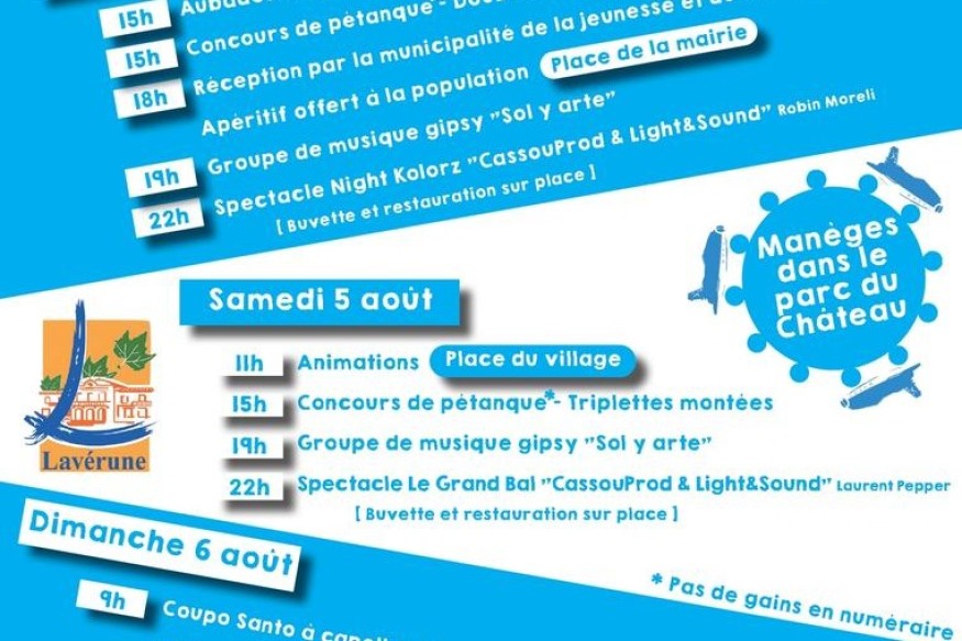 Ne manquez pas les Fêtes votives de Lavérune du 04 au 06 août 2023 !Au programme:- Aubades, concours de pétanque, Groupe de musique gipsy, spectacle Night Kolorz, spectacle le grand bal