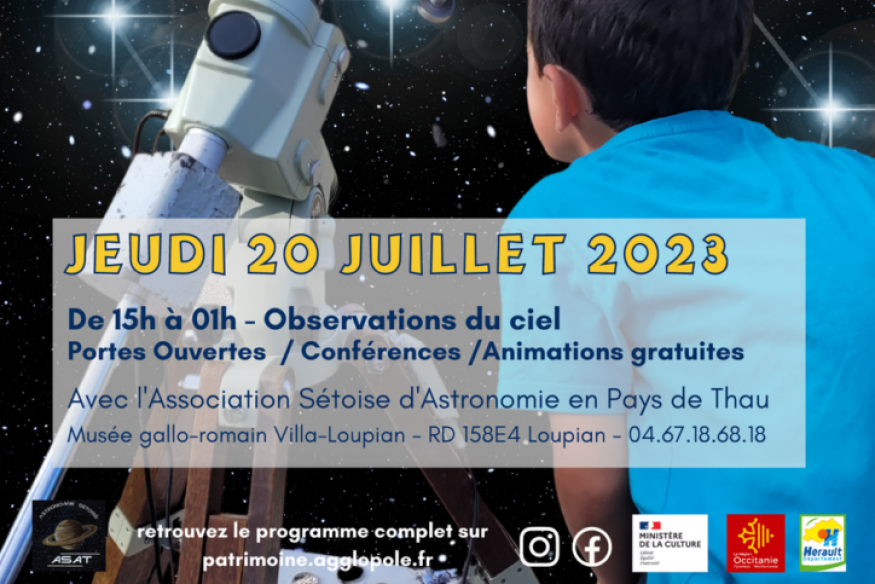 Jeudi 20 juillet Journée porte ouverte, visite libre du musée et du site archéologique de 10h à 13h et de 15h à 19h (dernière entrée 1h avant la fermeture). En amont de la 32e édition des Nuits des Etoiles sur la thématique “Poussières célestes”, venez profiter de la beauté du ciel estival avec l’Association Sétoise d’Astronomie en Pays de Thau.