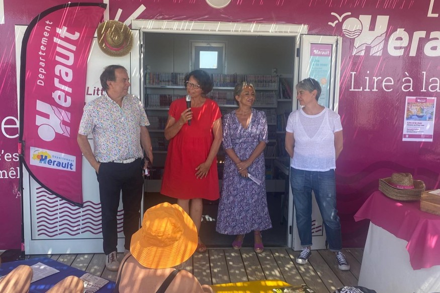 Le maire de Mauguio Yvon Bourrel et Marie-Pierre Pons,5ème vice-présidente déléguée à la culture du Département de l'Hérault, ont inauguré l’espace et présenté le programme des animations estivales de l'opération "Lire à la mer".