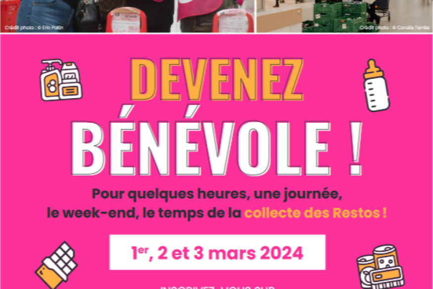 « Les Restos du Cœur ont besoin de vous » La Collecte Nationale des Restos du Cœur se déroulera les 1,2 et 3 mars prochains dans toute la France. Chaque année, elle s’affirme comme un grand moment de solidarité et de convivialité. Du vendredi 1 au dimanche 3 mars inclus, les bénévoles des Restos seront présents dans des milliers de supermarchés et commerces dans toute la France pour récolter des denrées alimentaires et des produits d’hygiène. Rejoignez-nous comme......