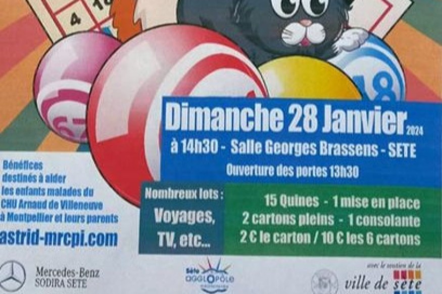 L'Association Astrid-MRCP organise son GRAND LOTO ce dimanche 28 Janvier 2024 à 14H30 dans la Salle Georges Brassens (Parking du Mas Coulet à Sète/ ouverture des portes à 13H30).
