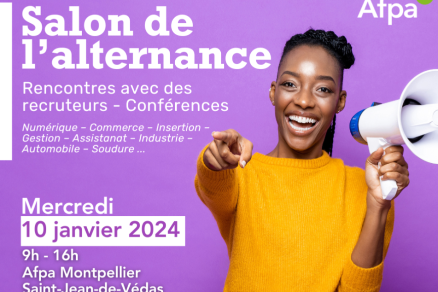 Le Centre Afpa de Montpellier Saint-Jean-De-Védas organise le Salon de l’Alternance le mercredi 10 janvier 2024, de 9h à 16h, au 12 rue Jean Mermoz, Saint-Jean-de-Védas.