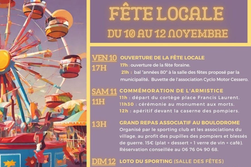 La fête locale de Saint-Thibéry se déroulera du 10 au 12 novembre. La fête foraine est installée au cœur du village autour de la mairie