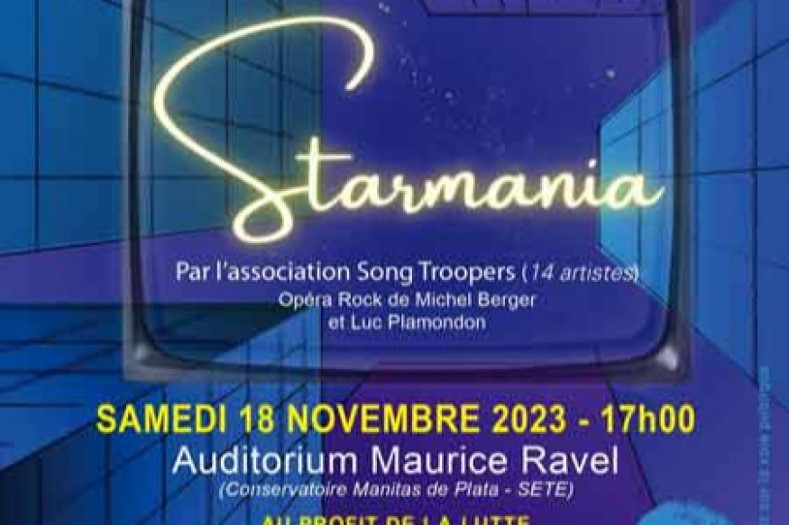 Samedi 18 novembre, à 17 h, le Rotary club doyen de Sète organise la venue du spectacle Starmania interprété par la troupe de l’association Song Troppers au conservatoire Manitas-de-Plata. Les quatorze chanteuses et chanteurs qui la composent vont reprendre cet opéra rock créé par Michel Berger et Luc Plamondon en 1978. Les Song Troppers assurent rechercher « les émotions originelles » d’une écriture « si en avance sur son temps qu’elle n’a finalement pas été immédiatement......