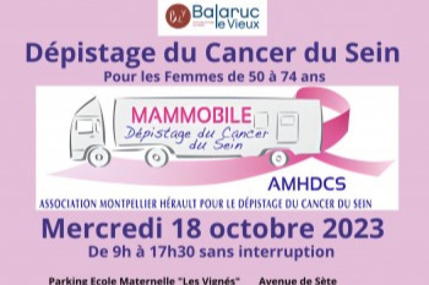 Le MAMMOBILE sera présent le Mercredi 18 octobre de 9h à 17h30 sans interruption sur le parking de l'école maternelle "Les Vignés" (avenue de Sète) pour un dépistage du cancer du sein pour les femmes de 50 à 74 ans.
