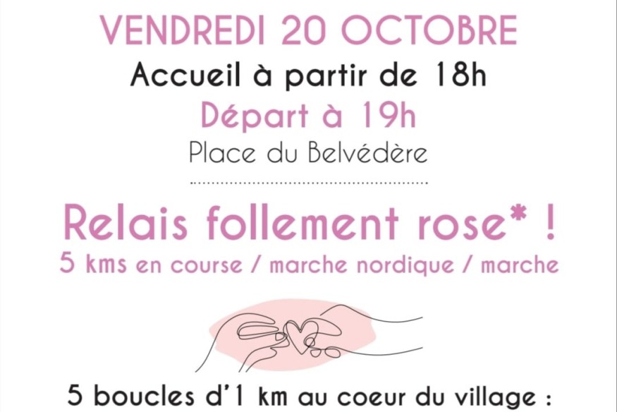 Venez marcher ou courir pour la bonne cause VENDREDI 20 OCTOBRE Accueil à partir de 18h Départ à 19h Place du Belvédère Relais follement rose*! 5 kms en course marche nordique marche 5 boucles d'1 km au coeur du village: rire ou courir, pas besoin de choisir suivi d'un verre de l'amitié au profit du collectif Thau en rose qui oeuvre à la sensibilisation et au dépistage précoce du cancer du sein ainsi quà l'accompagnement des malades au travers des soins de supports. Boucle de 1km à réaliser 5 fois seul ou en équipe relais de 2 à 5 personnes.......
