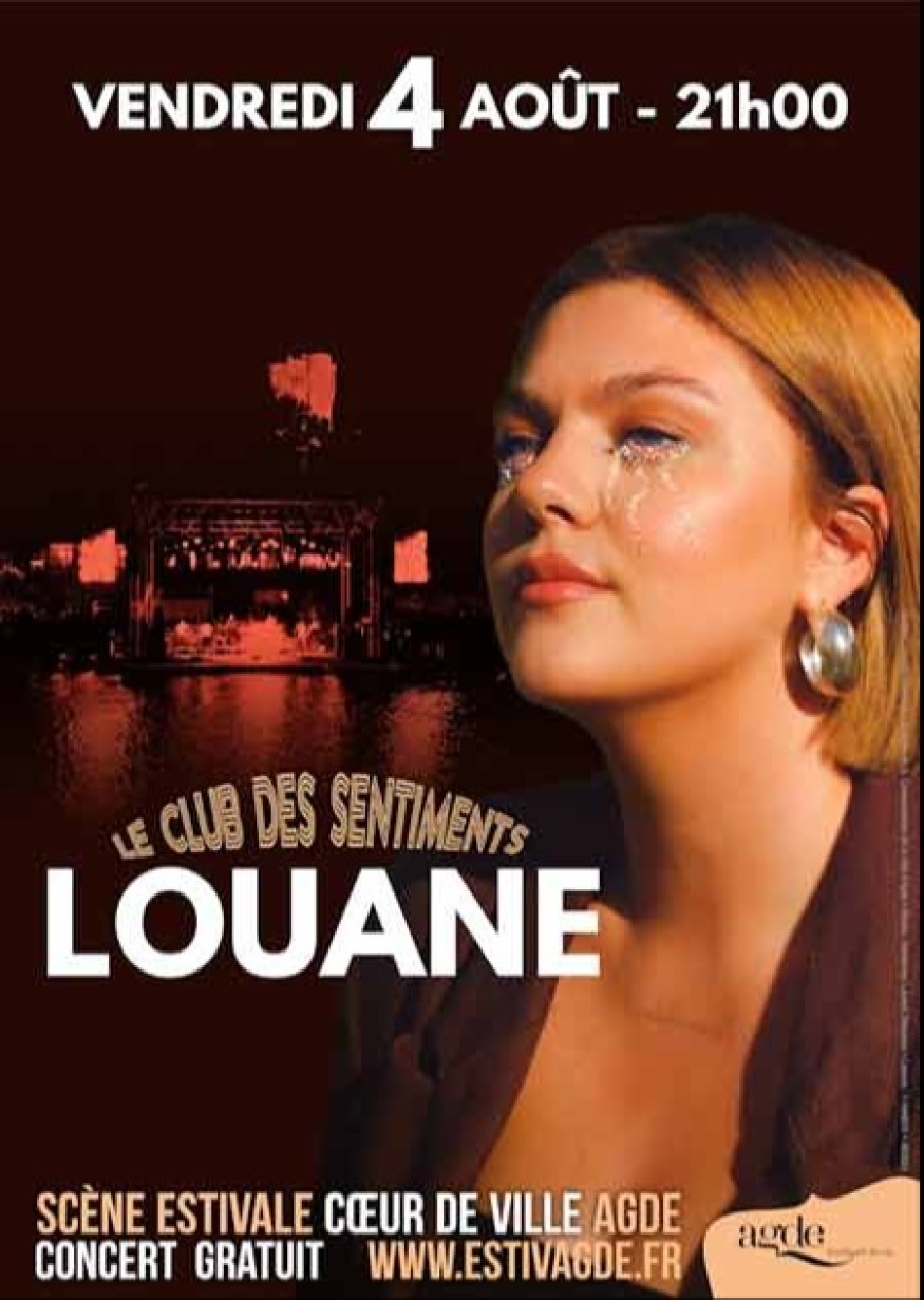 Concert Louane à Agde – Scène Flottante 2023. Vendredi 04 Août 2023 à 21H00. Sur la scène flottante, au pied de la cathédrale Saint-Etienne, au cœur de la cité d’Agde. Retrouvez sur la Scène Flottante estivale : LOUANE pour un concert exceptionnel. Concert Gratuit.