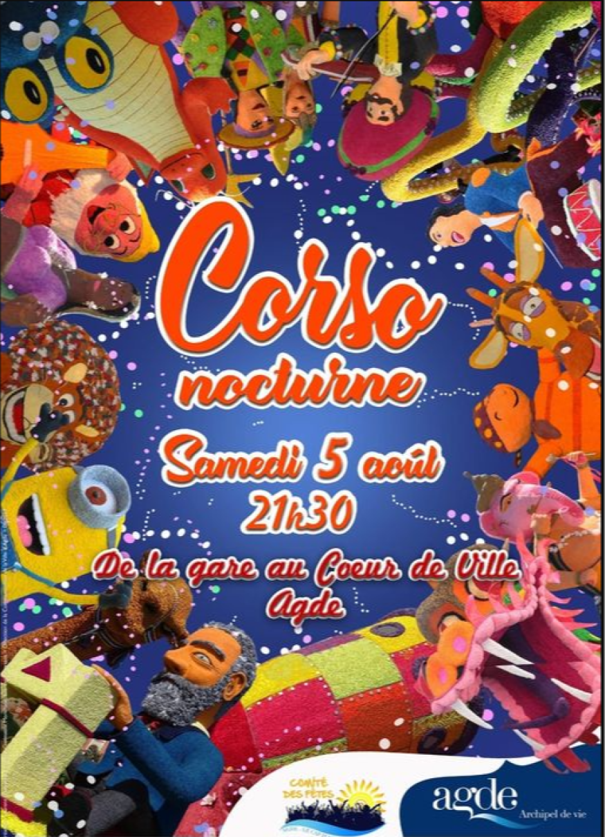 Le comité des fête d'Agde orgnanise un Corso norcturne entre la gare et le coeur de ville, samedi 5 août 2023 à partir de 21h30.