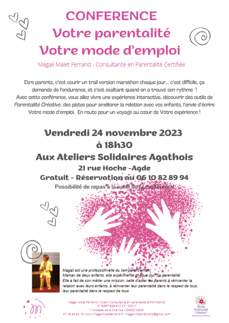 Avec cette conférence, vous allez vivre une expérience interactive, découvrir des outils de Parentalité Créative, respectueux des besoins de chacun, des pistes pour améliorer la relation avec vos enfants, l’envie d’écrire Votre mode d’emploi ! En route pour un voyage au cœur de Votre expérience !"