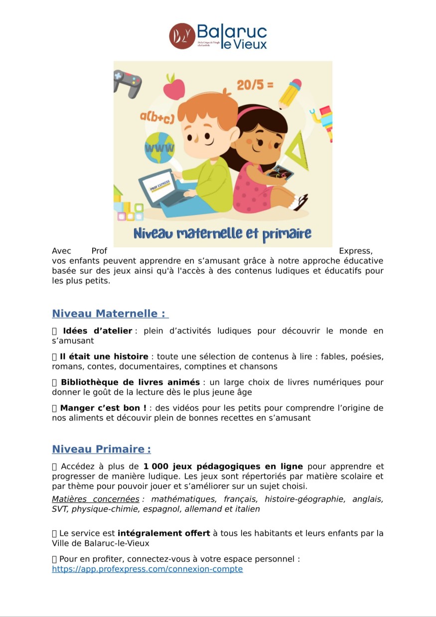 Matières concernées : mathématiques, français, histoire-géographie, anglais, SVT, physique-chimie, espagnol, allemand et italien Le service est intégralement offert à tous les habitants par la Ville de Balaruc-le-Vieux.