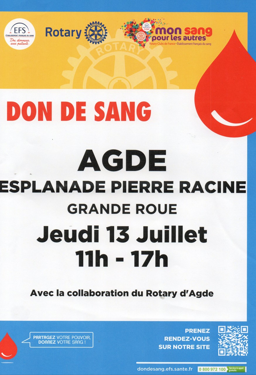 Le Rotary Club Agde - Cap d’Agde, en collaboration avec l’ EFS (Etablissement Français du Sang) organise une collecte de Sang : "Mon Sang Pour Les Autres" le jeudi 13 juillet de 11h00 à 17h00 sur l’ esplanade Pierre Racine (grande roue) au Cap d’Agde dans 2 camions de l’EFS.