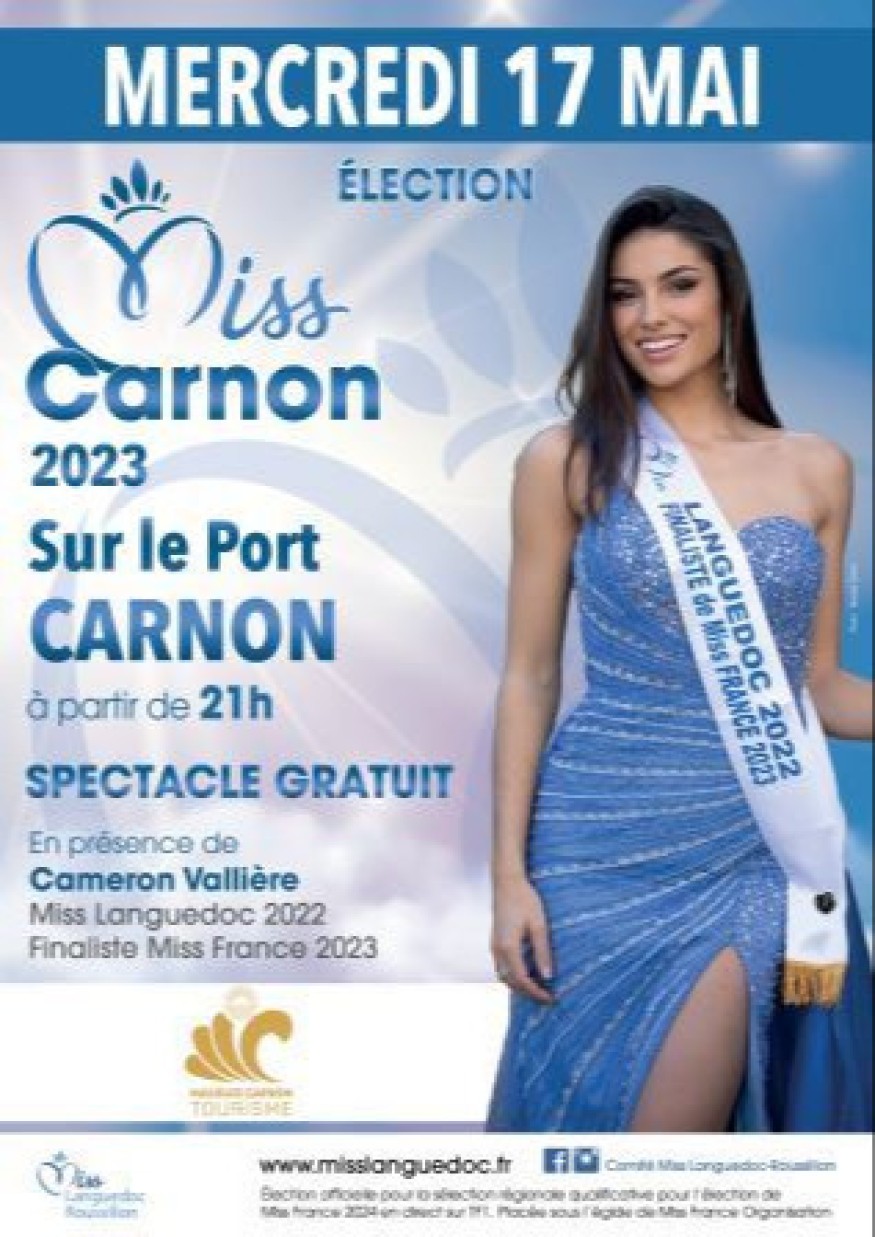 Mercredi 17 mai Retrouvez comme chaque année, l’élection de Miss Carnon sur le Port en présence de Cameron Vallière (Miss Languedoc-Roussillon 2022, Finaliste Miss France 2023)