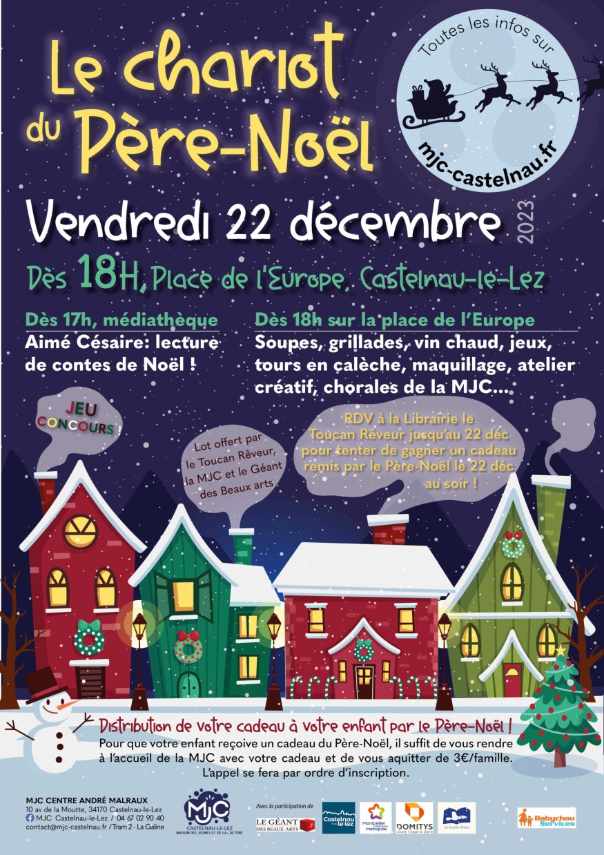 Au programme de cet événement familial sur la place de l’Europe : stands jeux, coloriages, maquillage et atelier créatif pour les enfants. Les chorales enfants et adultes de la MJC interpréteront également quelques chansons en attendant l’arrivée du Père Noël en calèche à 18 h 30. S’en suivra alors une remise de cadeaux des mains du Père Noël aux enfants inscrits. Et qui sait, les heureux gagnants d’un lot surprise, offert par la MJC, le Toucan Rêveur et le Géant des Beaux-arts se cacheront parmi les participants ! Rendez-vous directement au Toucan Rêveur pour s’inscrire, et le tirage au sort se fera le vendredi 22 décembre au soir par le Père Noël lui-même.