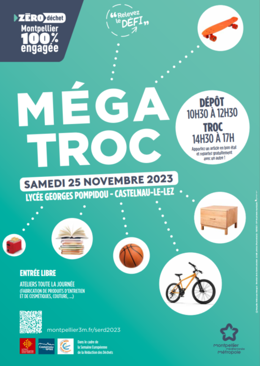 Méga troc au lycée Georges Pompidou A l'occasion de la Semaine Européenne de Réduction des Déchets et dans le cadre de sa politique Zéro Déchet, Montpellier Méditerranée Métropole se mobilise afin de sensibiliser les habitants du territoire à la réduction des déchets et plus largement à leur prévention. Rendez-vous au lycée Georges Pompidou à Castelnau-le- Lez samedi 25 novembre de 10h30 à 17h pour le Méga Troc ! Au programme : ateliers toute la journée, réparation de vélos, fabrication de produits d’entretien, de cosmétique, atelier couture… Apportez un article en bon état et repartez gratuitement avec un autre ! En partenariat avec le lycée G. Pompidou. Le Méga Troc, comment ça marche ? Triez et sélectionnez chez vous des objets en bon état