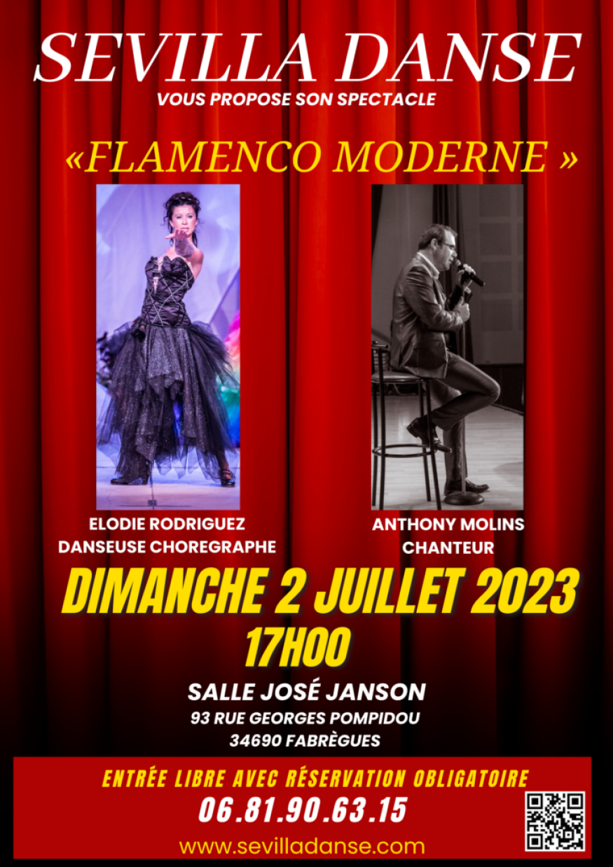 L’association Sévilla danse organise, dimanche 2 juillet à 17 h, au centre culturel José-Janson, salle Claude-Etienne, un spectacle de flamenco moderne avec Elodie Rodriguez, danseuse chorégraphe et Anthony Molins, chanteur.