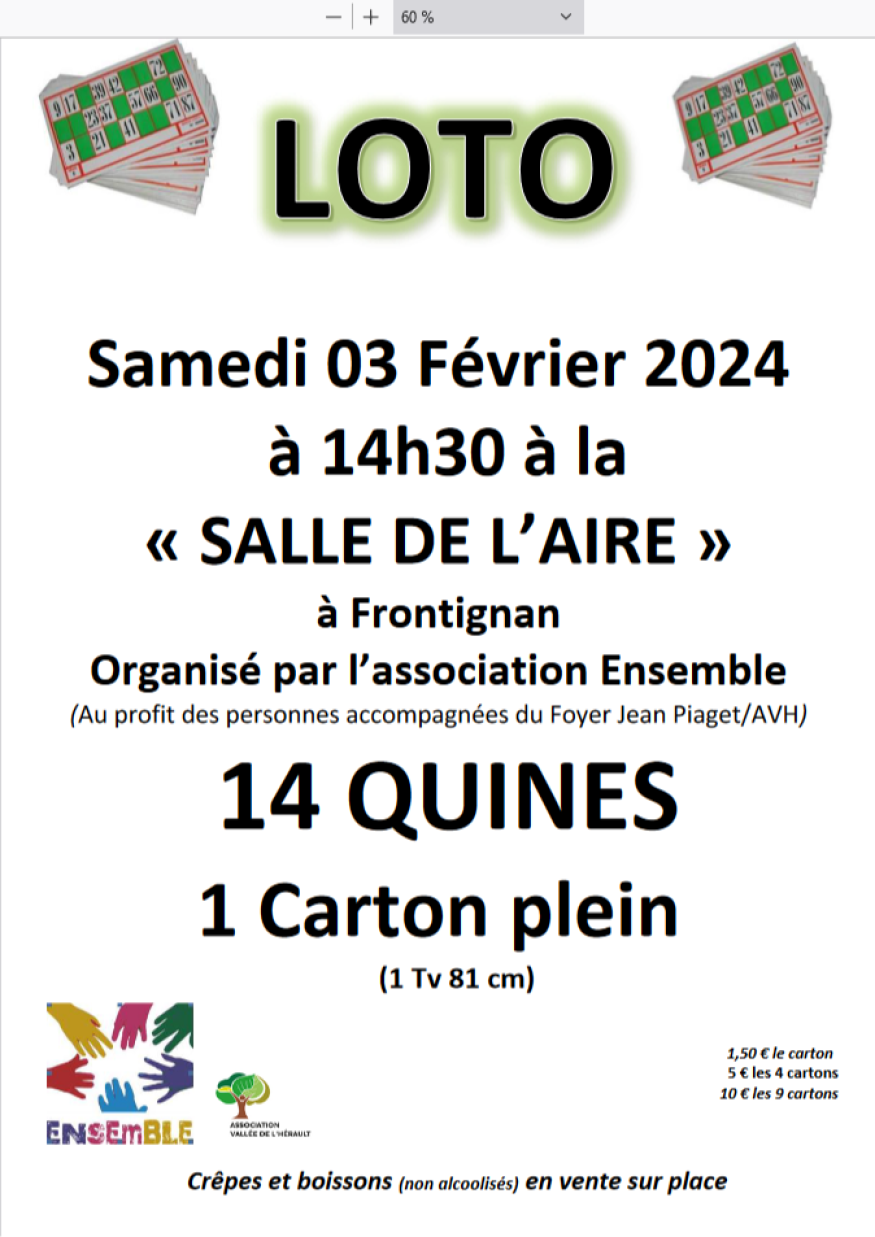 L’association « Ensemble » organise un loto le samedi 3 février 2024 à la Salle de l’Aire à Frontignan :14 quines, et un carton plein avec une TV de 81 cm à gagner