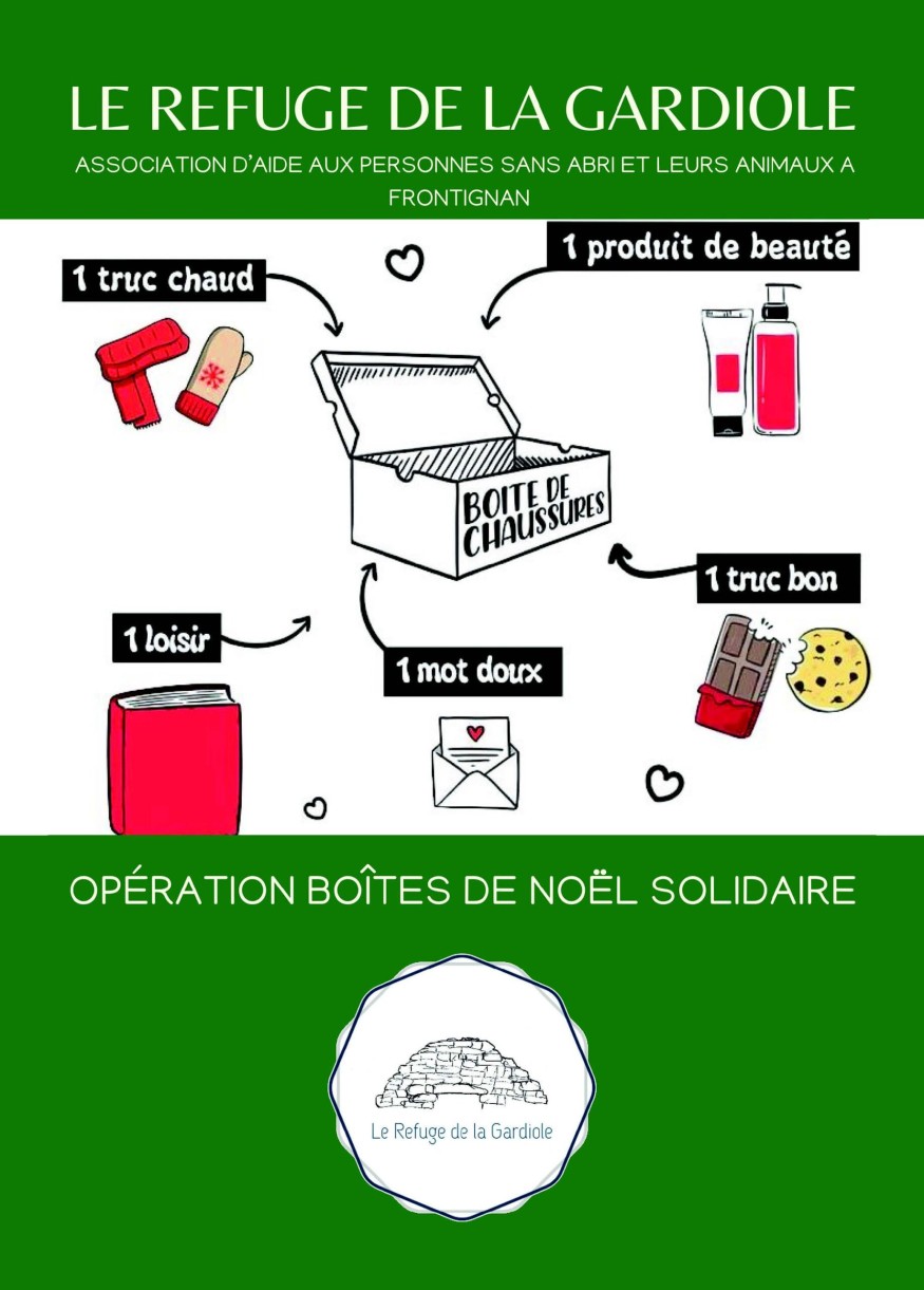 L’association Le Refuge de la Gardiole relance l’initiative des boîtes de Noël solidaires. Pour venir en aide et faire plaisir aux personnes sans abri en cette période de fêtes de fin d’année, chacun peut confectionner une boîte cadeau olidaire comprenant un vêtement chaud (une paire de chaussettes, un pull, des gants), un loisir (livre, cartes à jouer, petit mot gentil), un produit d’hygiène, des friandises et autres petits cadeaux qui pourraient faire plaisir… le tout dans une boîte emballée d’un joli papier cadeau et étiqueté homme ou femme.