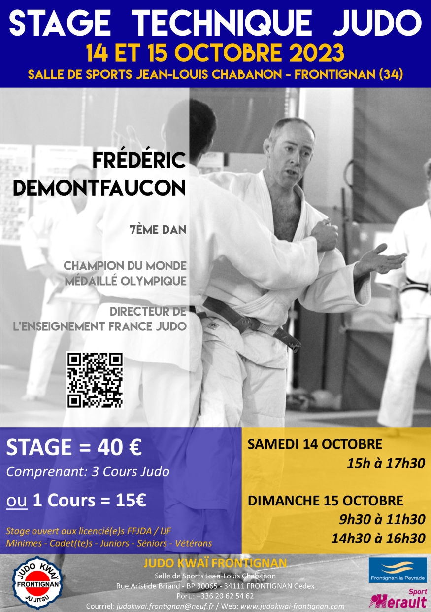 Le Judo Kwaï Frontignan organise Samedi 14 et Dimanche 15 Octobre 2023 son 6ème stage sous la direction technique de M. Frédéric Demontfaucon, 7ème Dan, Champion du Monde, Médaillé Olympique et Directeur de l'enseignement à France Judo.