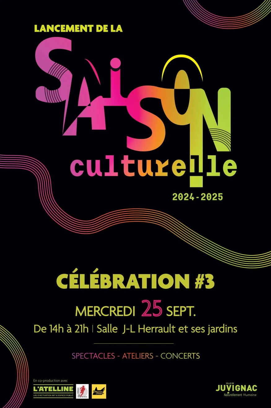 Avec « Célébration #3 », la culture fait sa rentrée à Juvignac le 25 septembre prochain ! L’événement sonne le coup d’envoi d’une nouvelle saison culturelle et propose une programmation enthousiasmante, concoctée par la Ville et L’Atelline, Scène conventionnée d’intérêt général « Art vivant en espace public », avec la participation de la Compagnie Les Têtes de Bois et Mama Sound Soulfire. Un rendez-vous familial à vivre de 14h à 21h, en plein air et en entrée libre !